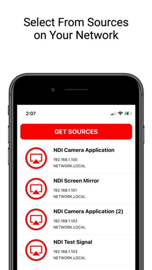 This app presents a list of NDI streams that are available on your local network. Simply tap on the source to begin streaming the video and audio from that source.