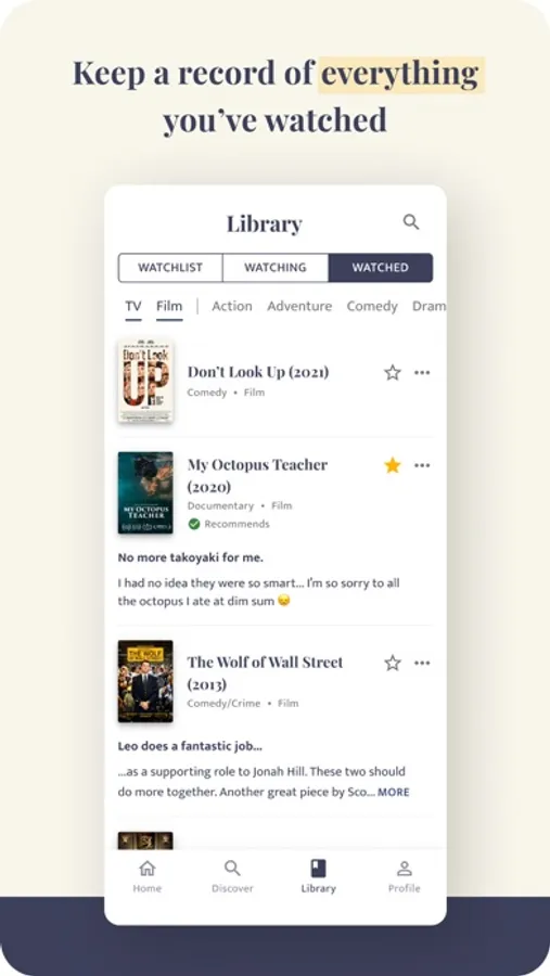 - A beautiful library for logging films and shows: Track everything you've watched, the titles on your watchlist, and the shows you're currently watching (with season by season progress)