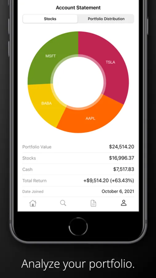 • Account Statement: Get key statistics on the performance of your investments. PocketProfit leverages pie chart visualizations to describe your portfolio allocation.
