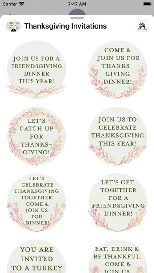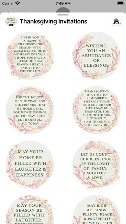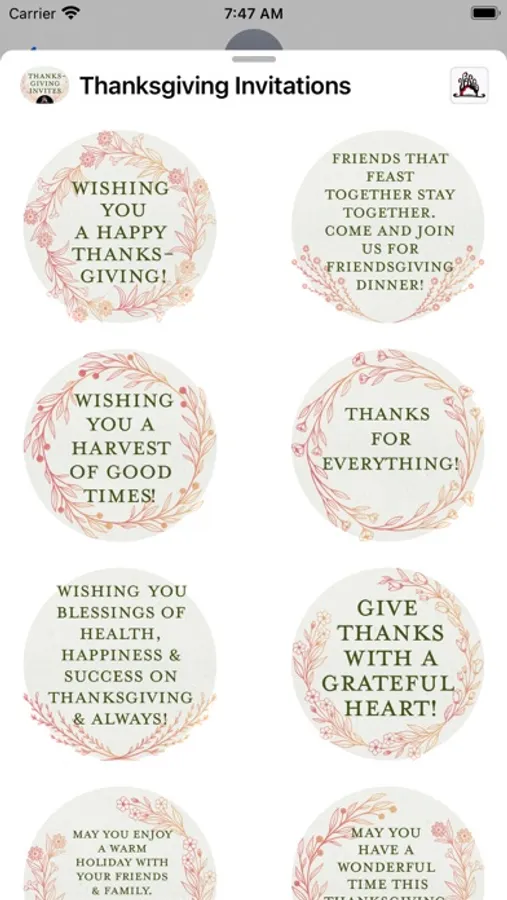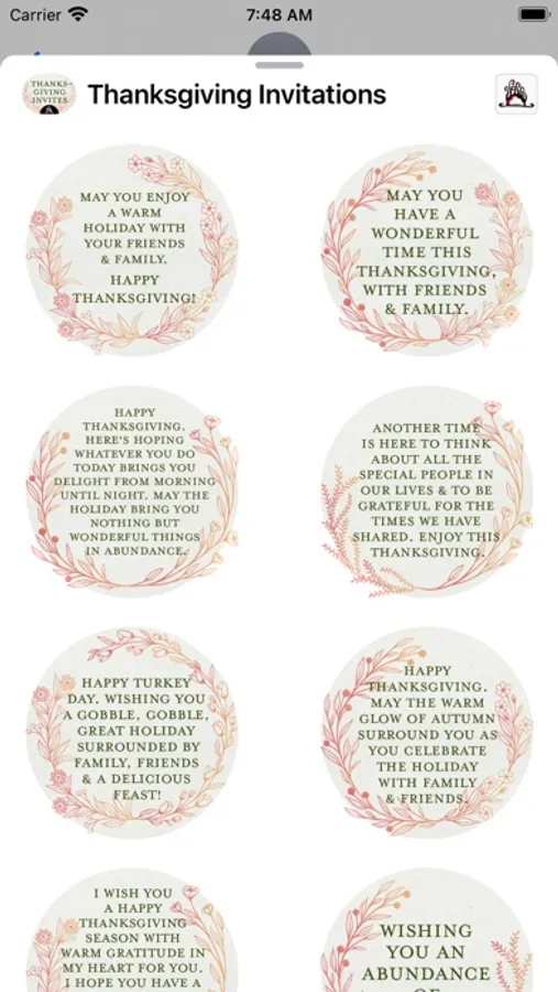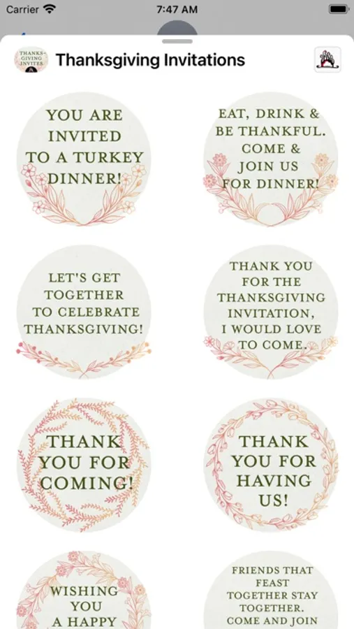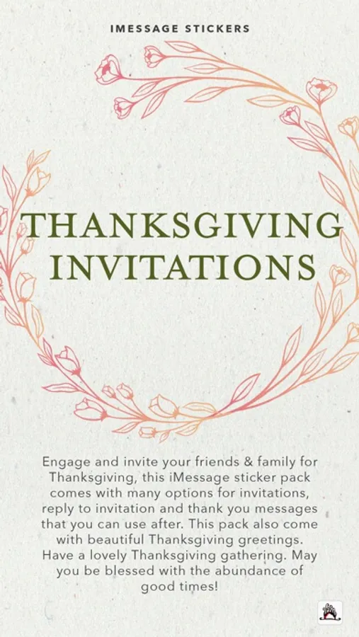 Engage and invite your friends & family for Thanksgiving, this iMessage sticker pack comes with many options for invitations, reply to invitation and thank you messages that you can use after. This pack also come with beautiful Thanksgiving greetings, meaningful messages, thank you greetings and quotes to show your gratitude that you can send to your friends and family, and anyone in your life that you want to show your love and appreciation to, especially during Thanksgiving time. Have a lovely Thanksgiving gathering. May you be blessed with the abundance of good times!
