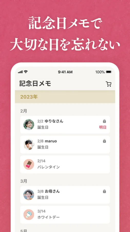 さらに、友人や家族との記念日が通知されるため、ギフトを贈るタイミングを逃しません。