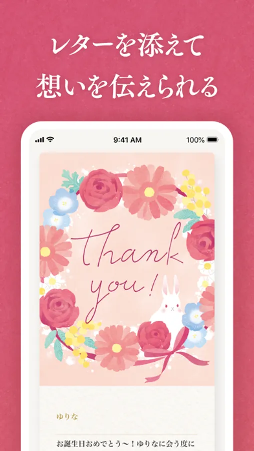 お祝いや感謝の気持ちを伝えるレターと、ギフトを華やかに装飾するラッピングオプションとともに、ギフトを贈ることができるアプリです。