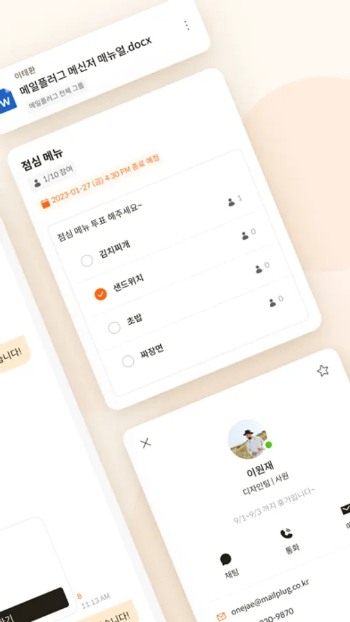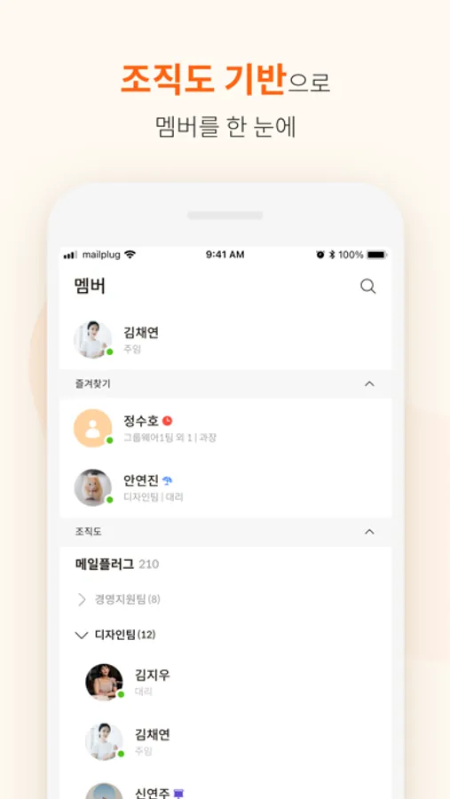 - 조직도 기반으로 전체 멤버를 한 눈에 확인하고 채팅 상대를 빠르게 선택할 수 있습니다.
