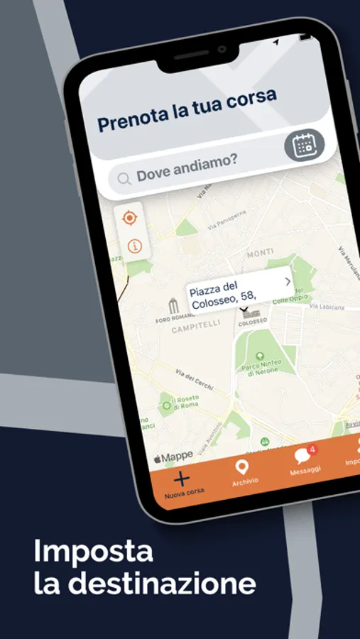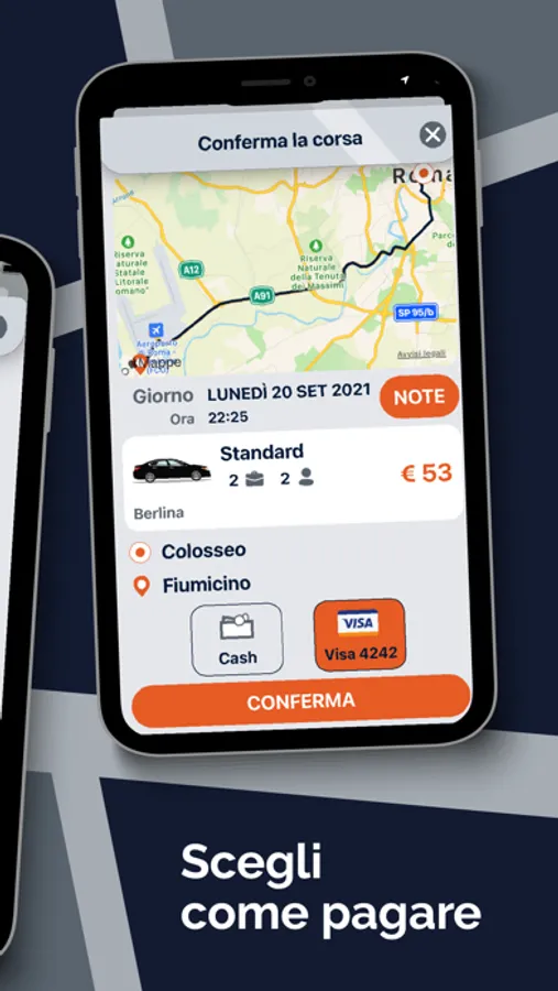 Apri l'app e prenota subito la tua corsa, in automatico riceverai il numero del tuo autista in modo da poterlo contattare per qualsiasi necessità, in più potrai pagare il servizio anticipatamente con carta di credito, o in contanti direttamente in macchina.