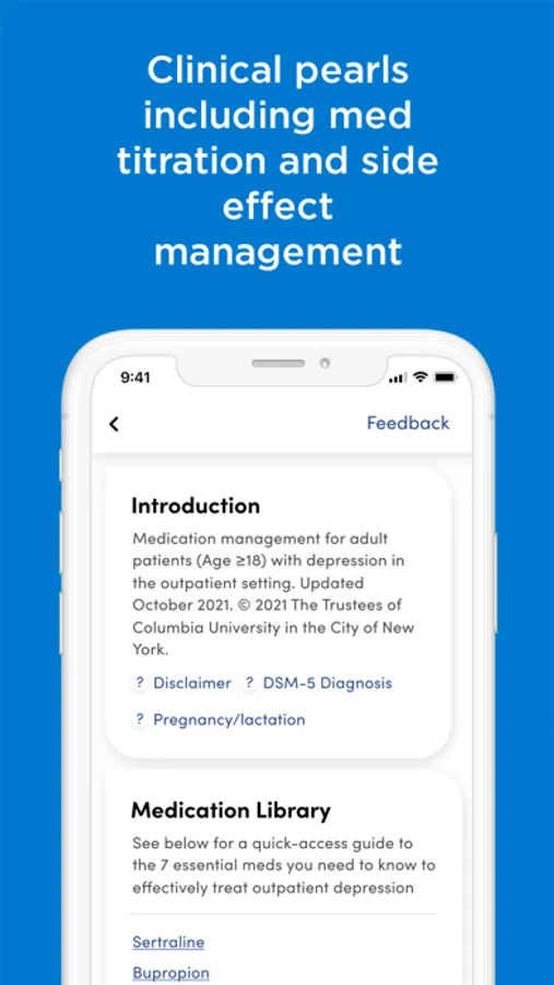 Designed by expert psychiatrists from Columbia University and delivered via cutting-edge, interactive technology from avoMD, this evidence-based app provides a practical and easy-to-use treatment algorithm for major depression.