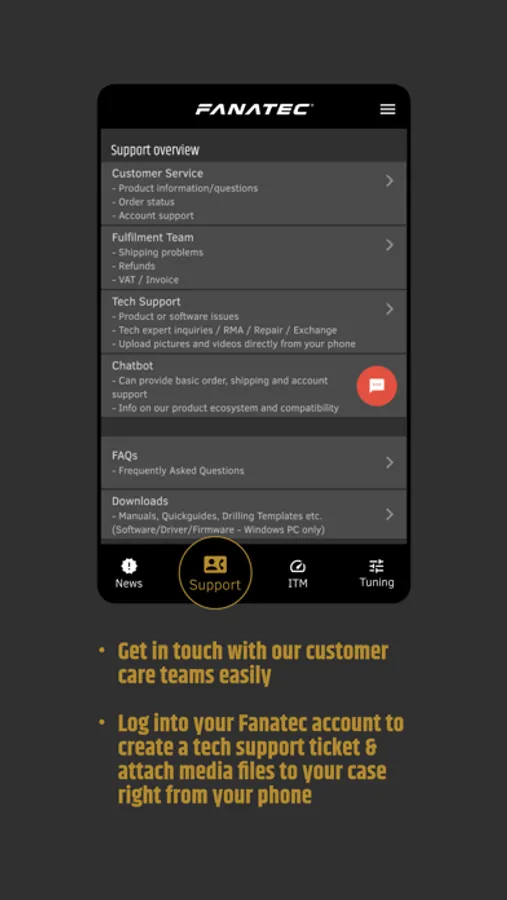 Find FANATEC® news and support all in one place. Take control of your Fanatec hardware with your mobile device.