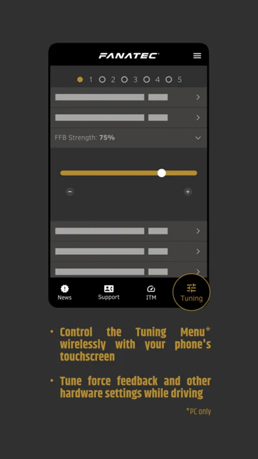 The Fanatec App connects with Windows PC, allowing wireless Tuning Menu adjustments and turns your phone into a racing display via WiFi.