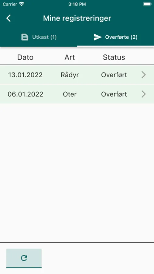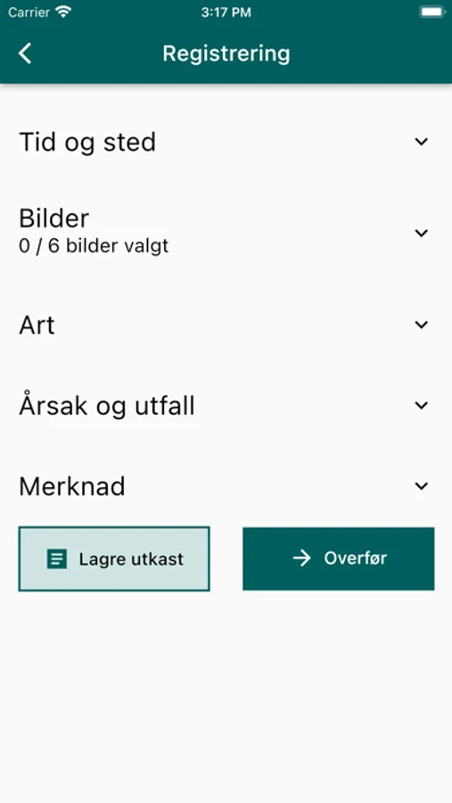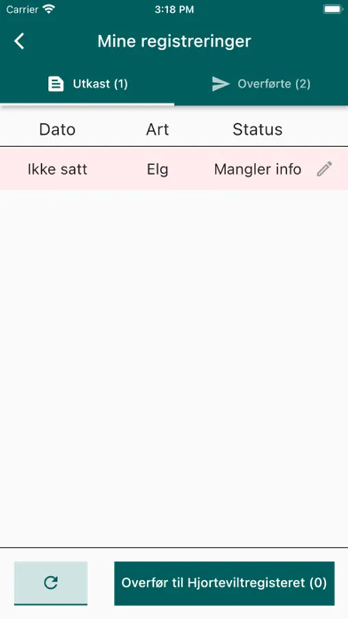 Du kan gjøre hele eller deler av registreringen, og lagre dette som et utkast på appen. Et utkast kan redigeres. Når alle felt er fylt ut, kan du overføre registreringen til Hjorteviltregisteret.