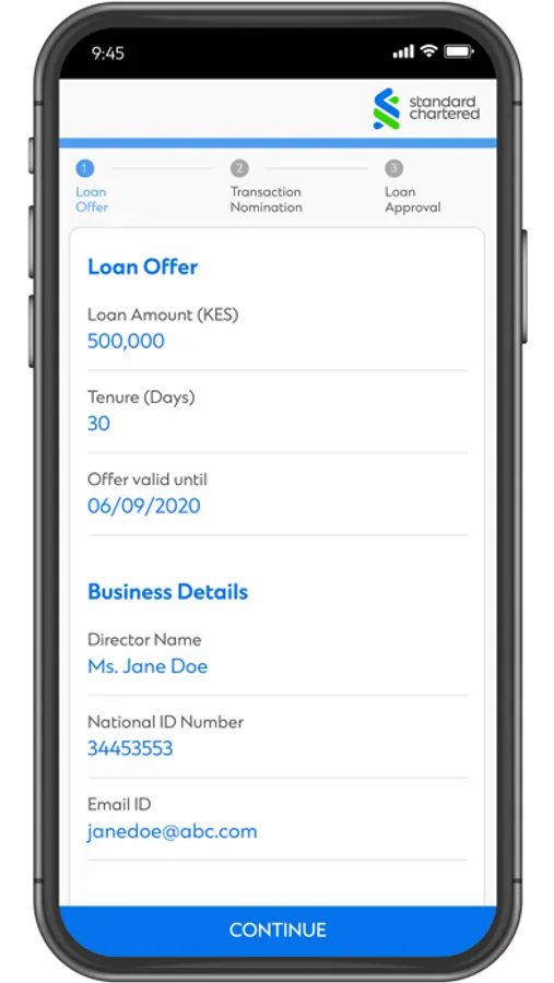 SC Business was designed with two things in mind; the mobile and you. With SC Business, you can now get instant short term financing, from anywhere and conveniently. It combines an intuitive interface with flexibility to choose the loan amount, the interest applicable by choosing when to pay within your approved parameters. Simply put Power in your hands.