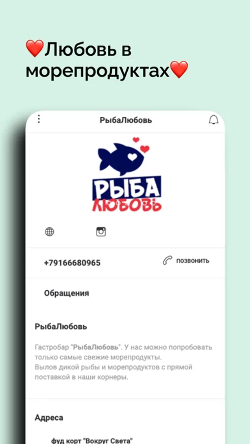 РыбаЛюбовь- все то, что вы любите. Свежие дикие морепродукты с доставкой. Быстрое обслуживание и программа лояльности. Акции и кампании на вкусные и полезные блюда. Попробуй нашу РыбаЛюбовь