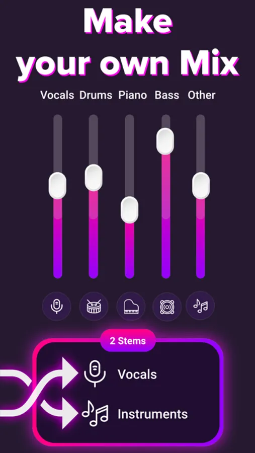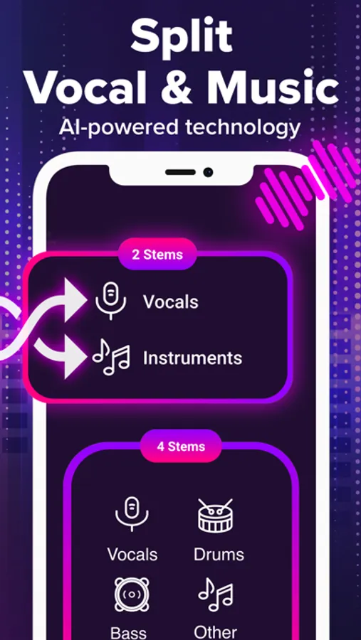 With Vocal Remover you can extract vocal, accompaniment and various instruments from any music. Isolates voice, bass, drums, guitar and piano in a very simple way, with high-quality stem splitting based on 100% AI-powered technology. You can extract 2 to 5 stems from any audio, fast, easy and precise without quality loss.