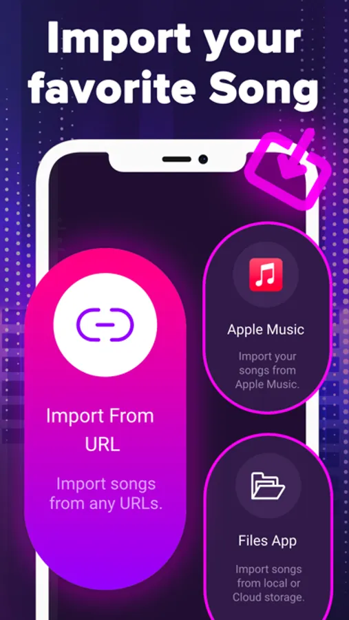 - Import audio from the Cloud, a URL, Photo Library or Apple Music. (Mp3 and M4A).
