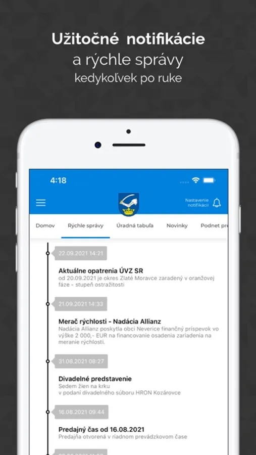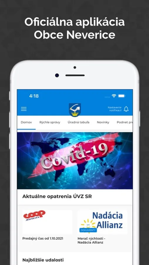 Mobilná aplikácia obce Neverice. V aplikácii nájdete aktuálne informácie z diania v obci, kalendár, dôležité kontakty aj top lokality. Môžete si nastaviť upozornenia na rôzne udalosti, od noviniek, cez udalosti kalendára až po denné sumáre. Obec Vám v prípade kritickej situácie (napr. povodne) môže poslať upozornenie priamo do aplikácie.