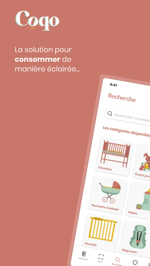 Coqo permet de connaître l'origine et les impacts sanitaires et environnementaux des produits de puériculture : biberons, tétines, poussettes, matelas à langer, jouets...