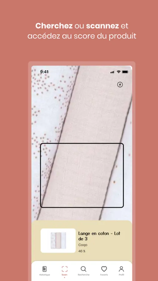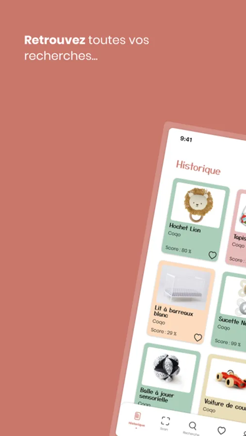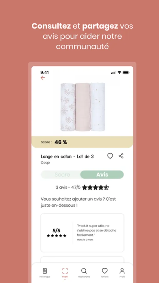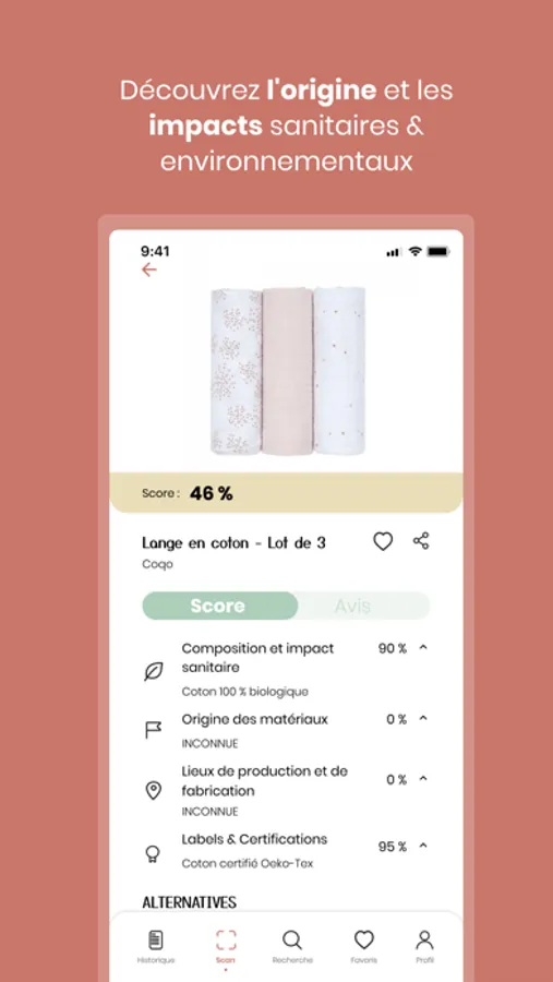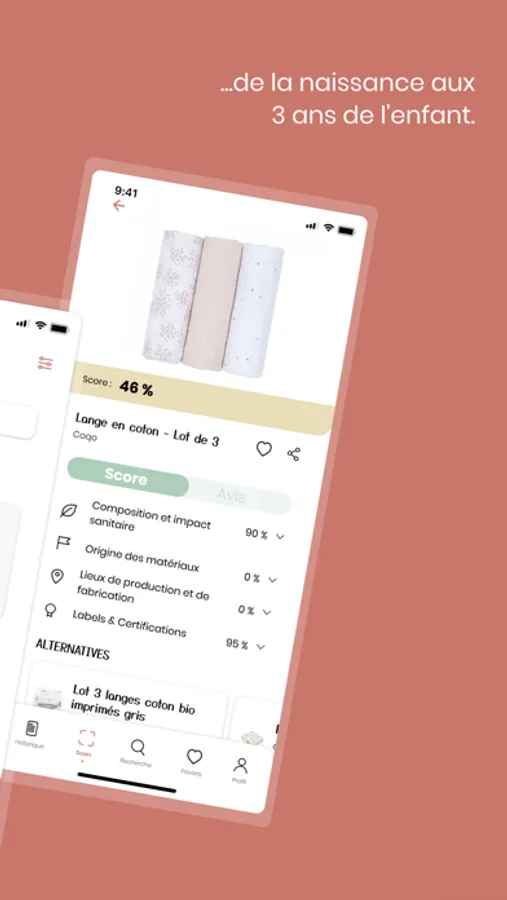 Il suffit de chercher ou scanner tout produit de puériculture (hors vêtements et alimentaire). Vous accèderez ensuite au score global du produit.