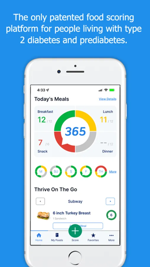 With Thrive365, you can rediscover the joy of food, health, and life. Thrive365 is the only patented, food scoring solution created to help people living with type 2 diabetes and prediabetes manage their meal-by-meal nutrition.