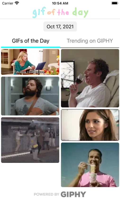 Six GIFs of the day, randomly chosen, along with the day's top trending GIFs on GIPHY.