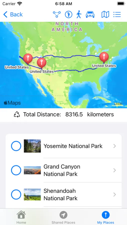 Places App allows users to share information about places with friends and family. You can create a list of places and share that list of places with others. You can have the app create an itinerary to visit each of the places based on the shortest distance between each of the places.