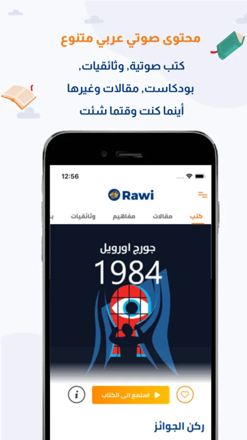 ﺣﻤﻞ ﺗﻄﺒﻴﻖ راوي ﻋﻠﻰ ﺟﻮاﻟﻚ واﺑﺪأ اﻟﺎﺳﺘﻤﺎع اﻟﻔﻮري ﻟﺒﻌﺾ اﻟﻜﺘﺐ اﻟﻤﺘﺎﺣﺔ ﻣﺠﺎﻧﺎ ﺑﺎﻟﺎﺿﺎﻓﺔ اﻟﻰ ﺑﻌﺾ اﻟﻤﺤﺘﻮى اﻟﺼﻮﺗﻲ اﻟﻤﺠﺎﻧﻲ ﻣﻦ وﺛﺎﺋﻘﻴﺎت ﺑﻮدﻛﺎﺳﺖ ﻣﻘﺎﻟﺎت ﻣﻦ دون أي ﺗﻜﻠﻔﺔ اﺿﺎﻓﻴﺔ