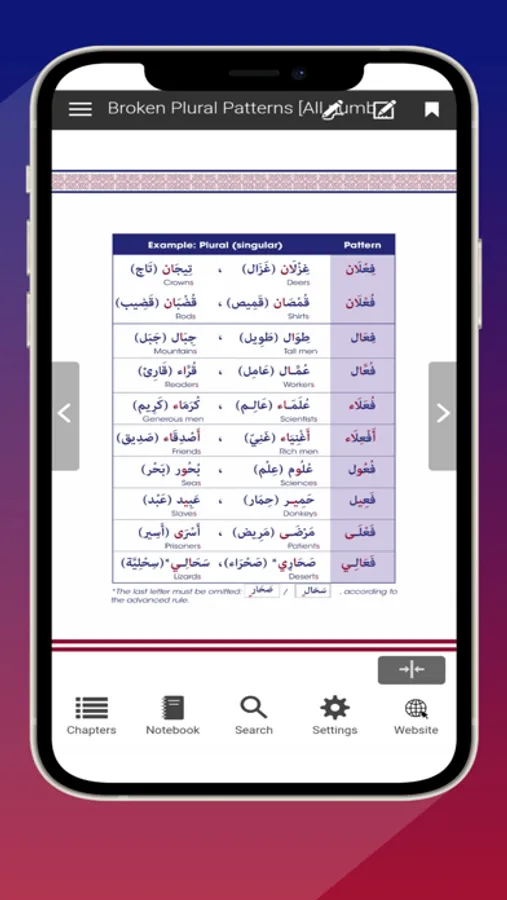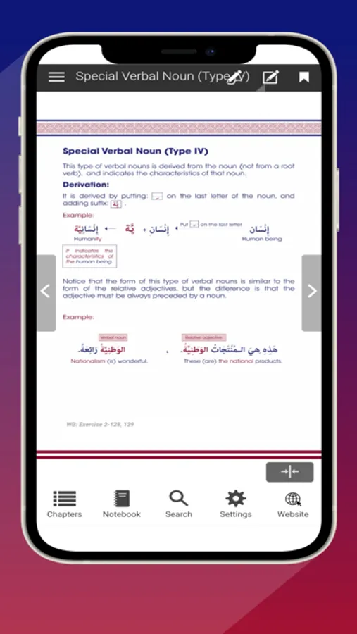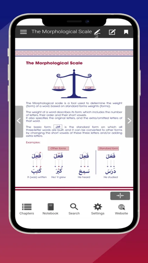 This app is an interactive ebook that includes advanced grammatical rules related to verbs, starting from the patterns and declension of the verbs to derivatives and infinitives.
