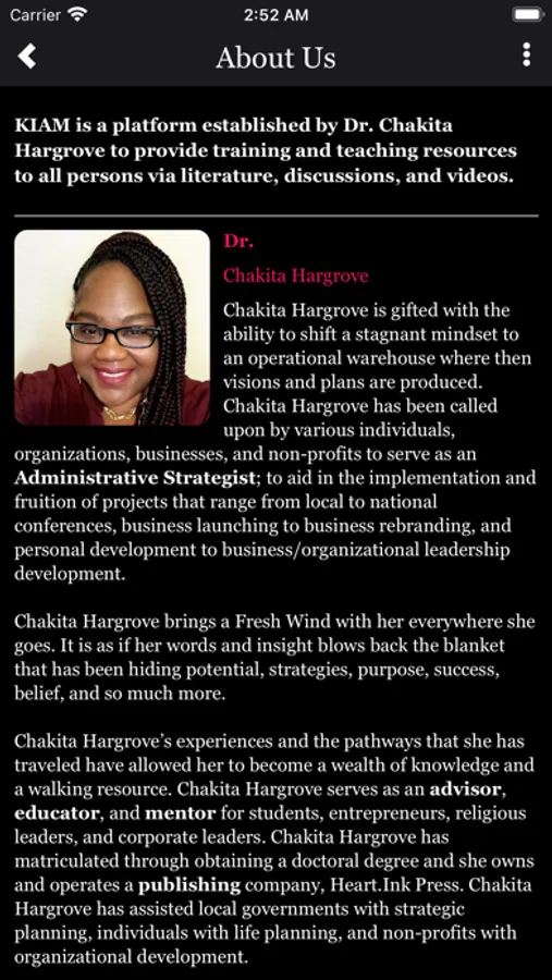 The KIAM Inc. app was created to be a platform for persons to have access to teachings, discussions, readings, and other resources provided by Dr. Chakita Hargrove and other contributors. Dr. Chakita has a passion to teach and equip others to grow and establish on purpose.