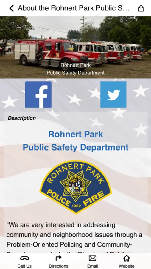 On behalf of the men and women of the Rohnert Park Department of Public Safety, welcome to our app. This app is for the employees and family members of the Rohnert Park Department of Public Safety and its retirees as well as the community it serves. It contains information about our department as well as safety and crime prevention tips. Rohnert Park Department of Public Safety employees will have access to a full range of wellness tools.