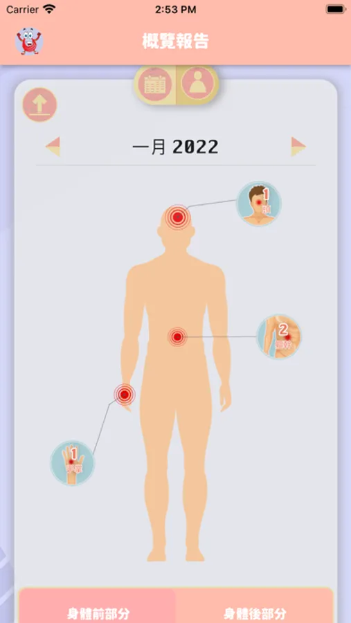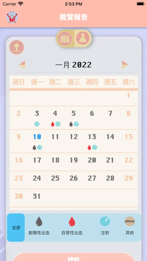 Appealing Calendar/Body Charts: Monthly summaries of bleeding and injection events