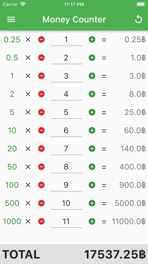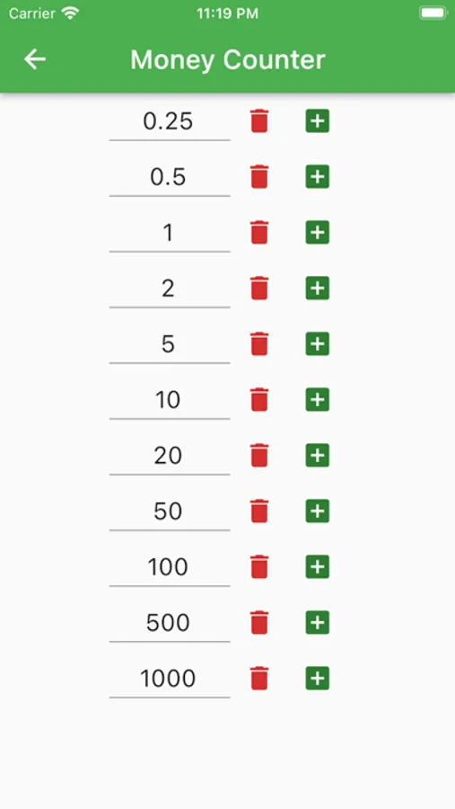 Money Counter makes a way for cash counting. It will help you to find out the total values of banknotes and coins effectively and also keep your counting for future usage. It's time to put away the old fashioned calculator and be more productive with Money Counter.