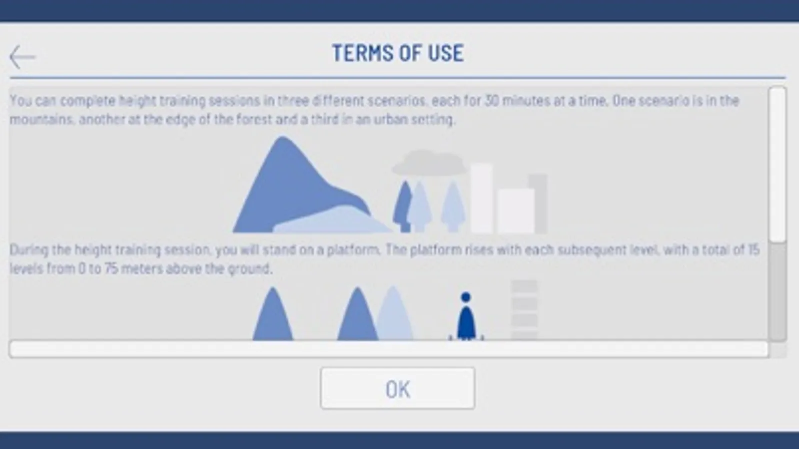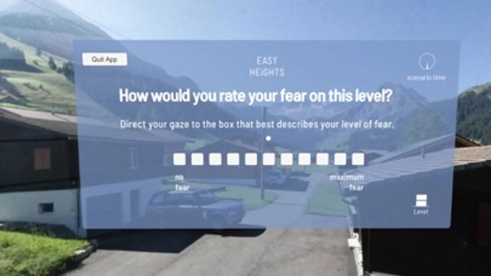 EASYHEiGHTS offers three scenarios (mountain landscape, forest edge, urban surroundings), providing the opportunity to become comfortable in height situations. In all three situations, the user stands on a platform that rises only when their fear at the current level allows. Each scenario has 15 levels. Initially, the platform moves up 1 meter to the next level. In the advanced levels, the height increases several meters at a time. At the final level, the platform is 75 meters above the ground.