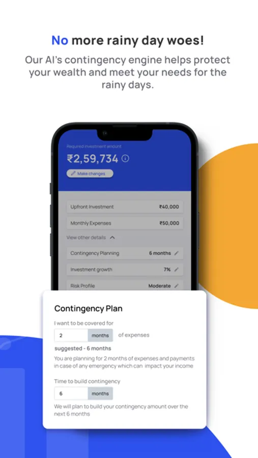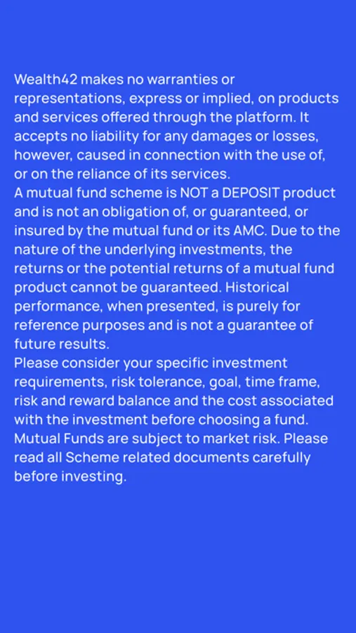 wealth42 gives you complete control. The app and our customer delight team can help you configure any subjective assumptions made to generate your investment plan, including but not limited to – Expected returns, Mutual Fund Asset Class Selection, Mutual Fund Selection, Inflation estimates, Risk Profile, etc.