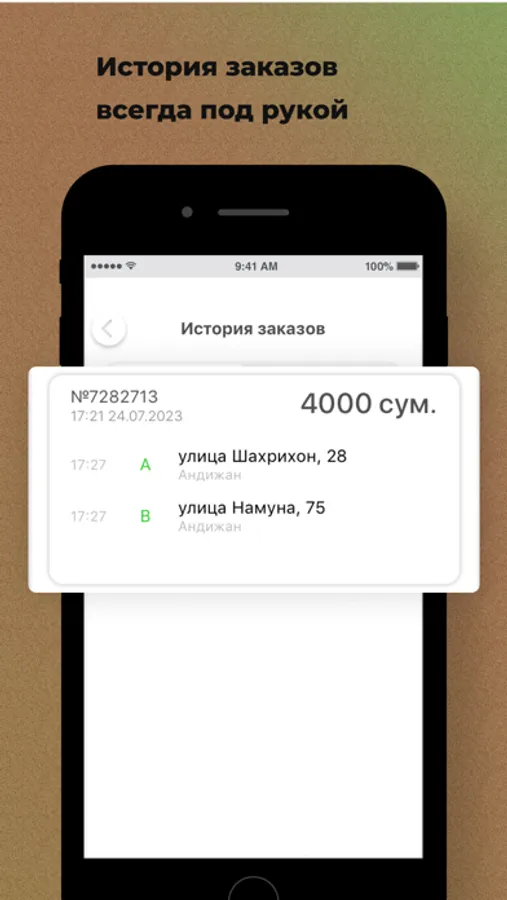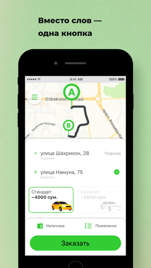 Закажите ARZONI BIZDA TAXI по Андижанской области через приложение. Это в 3 раза быстрее, чем по телефону! Между желанием доехать до нужного места и поиском автомобиля — пара секунд.
