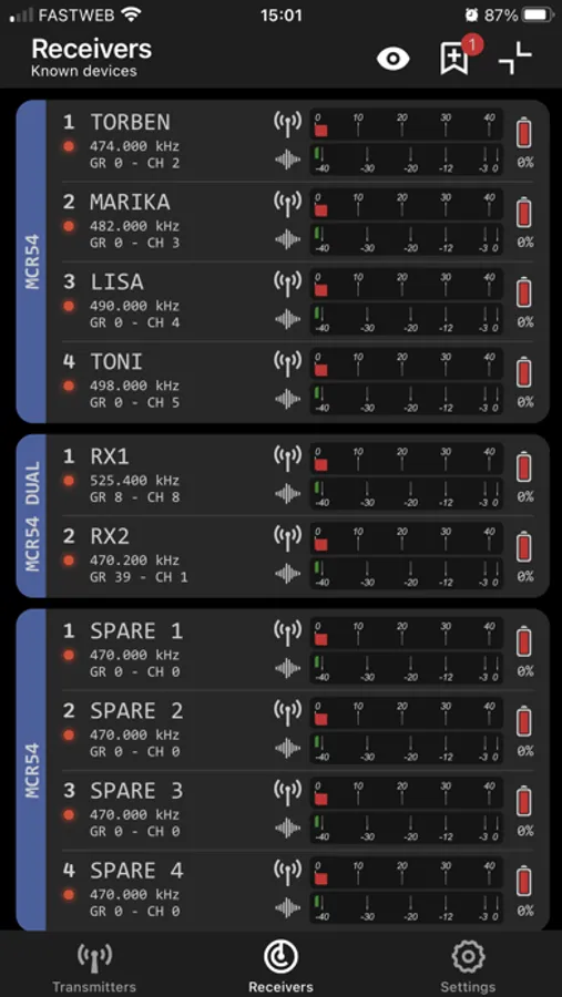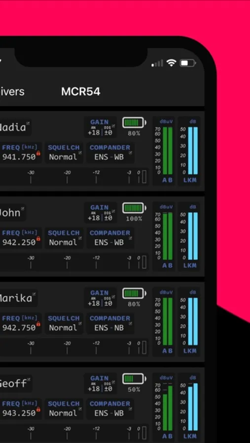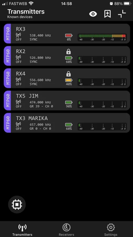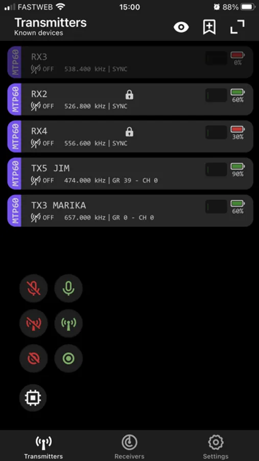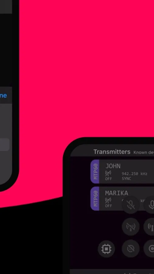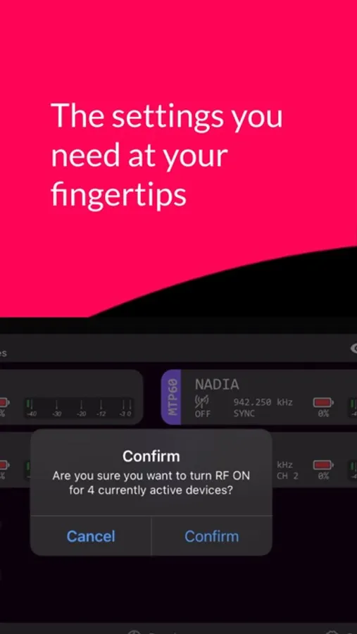 Scan Wisycom devices broadcasting general information about their status and manage your gears. Launch the App to monitor and control parameters including: remaining battery, channel name, RF and audio levels, channel group, frequency and more.