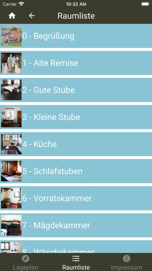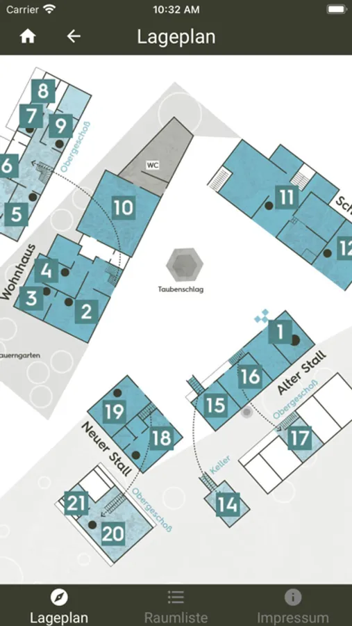 Mit dieser App erfahren Sie mehr über unseren Hof und seine Geschichte. Insgesamt gibt es 21 Räume, von denen jeder an einer eigenen Station erklärt wird. Zusätzlich gibt es an vielen Stationen Informationen und Geschichten zu einzelnen Dingen, die dort ausgestellt sind.