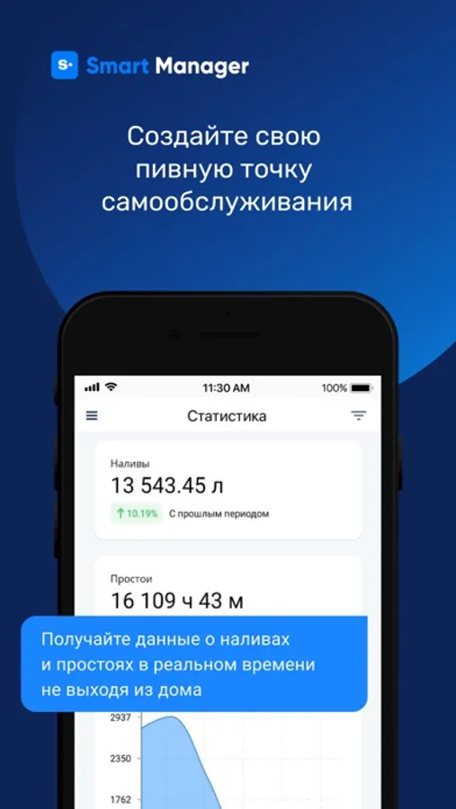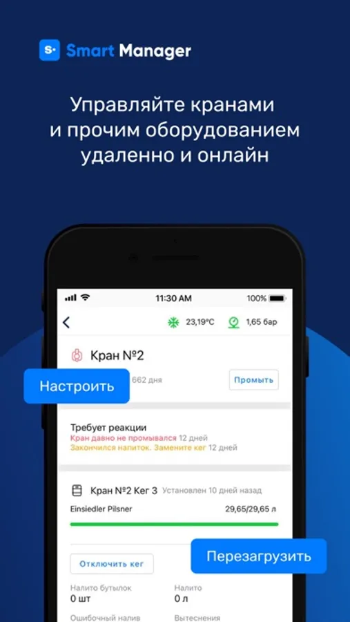 Проверьте давление в магистрали, уровень напитка в кегах или температуру охладителя. Отслеживайте статистику розлива, необходимость технического обслуживания и состояние пива в реальном времени.