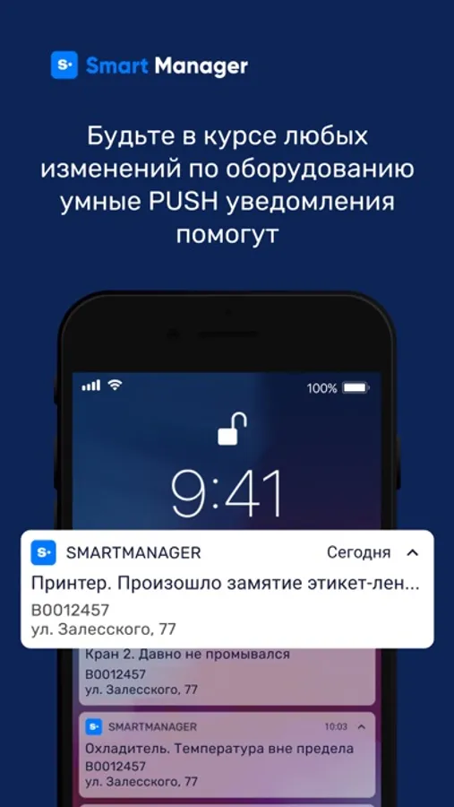 Закончился напиток? Высокая температура охладителя? Вы узнаете о ситуации в реальном времени получив push уведомления с данными по ошибке и адресом магазина.