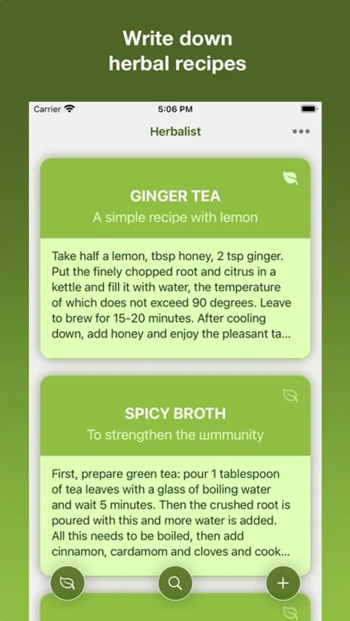 An application for creating your own collection of herbal recipes, teas and tinctures. Recipes are written in the form of cards with the possibility of their subsequent editing.