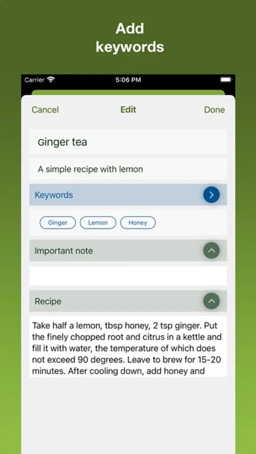 Each recipe card has its own title, subtitle, description, and note. You can type the text yourself in the card field, or you can copy the text from an open source and just paste it into the card field, add a title and keywords for the subsequent search for the desired recipe. It's that simple!