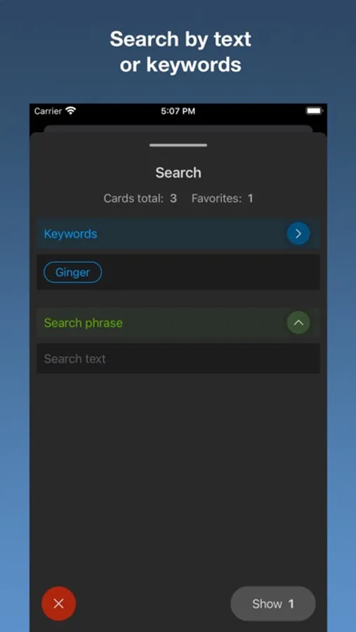 The full version removes the limitation on the number of cards, allows you to add recipe cards to Favorites, add keywords for each card, and also search for recipes by keywords and (or) by any search phrase.