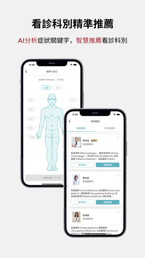 【 AI 醫生推薦】 基於 AI 分析的症狀集合與看診科別,推薦相關科別的專長醫生,並自動導向預約掛號。