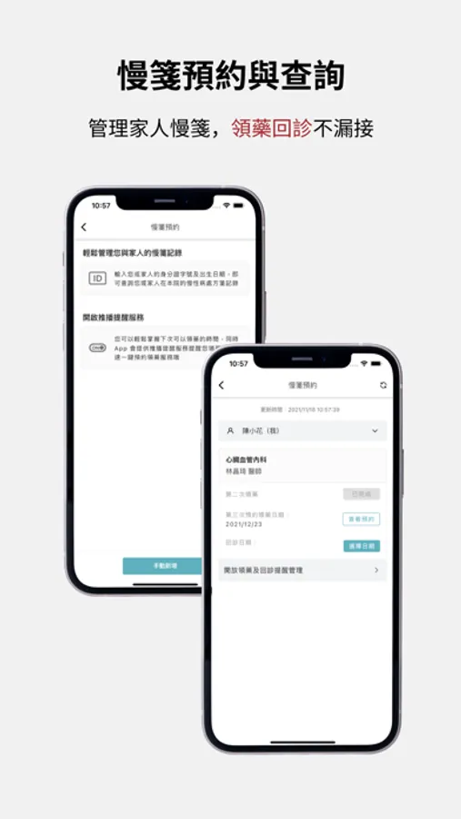 【慢箋預約】 提供慢箋預約及查詢服務,無需排隊領號碼牌,直接到藥局輕鬆取藥。 提供慢箋記錄管理的功能,讓您輕鬆管理您與家人的所有慢性疾病連續處方箋。個人化推播提醒服務,貼心通知,避免用藥中斷的風險。