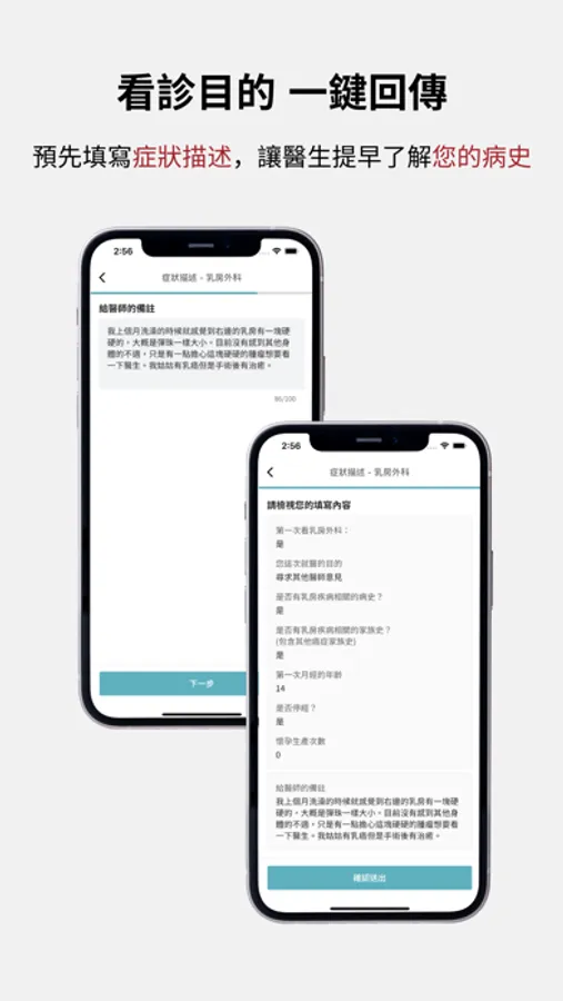 【診前問診】 就診前填寫詳細症狀描述,一鍵回傳院內系統,看診時協助醫師快速了解您的就診目的。