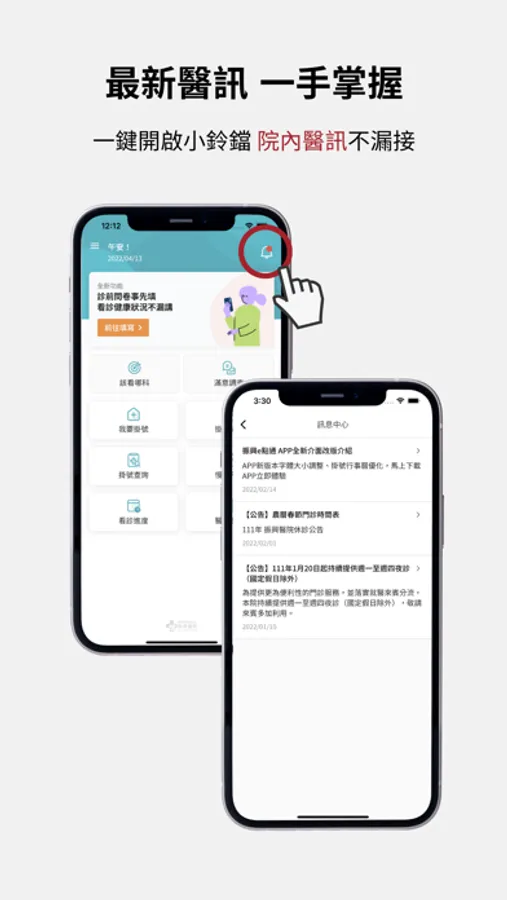 【訊息中心】 院內最新資訊 APP 即時推播不漏接,開啟首頁小鈴鐺也能即刻瀏覽過去遺漏的所有院方資訊。