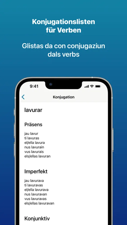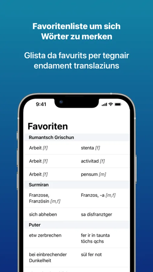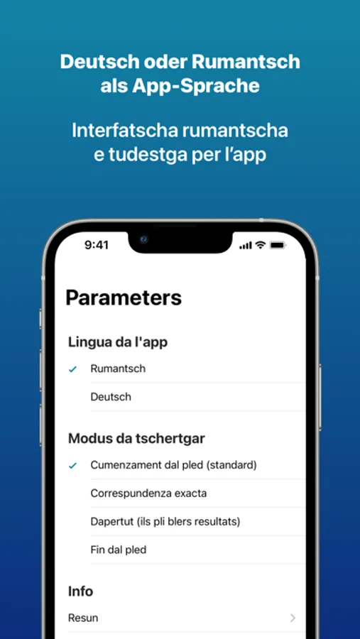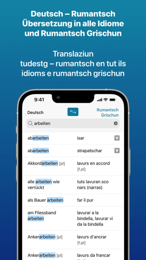 Weil alle Daten lokal gespeichert werden, funktioniert die App auch ohne Internetverbindung einwandfrei. Sie enthält Daten der fünf rätoromanischen Idiome, Sursilvan, Sutsilvan, Surmiran, Vallader und Puter sowie der Einheitssprache Rumantsch Grischun.