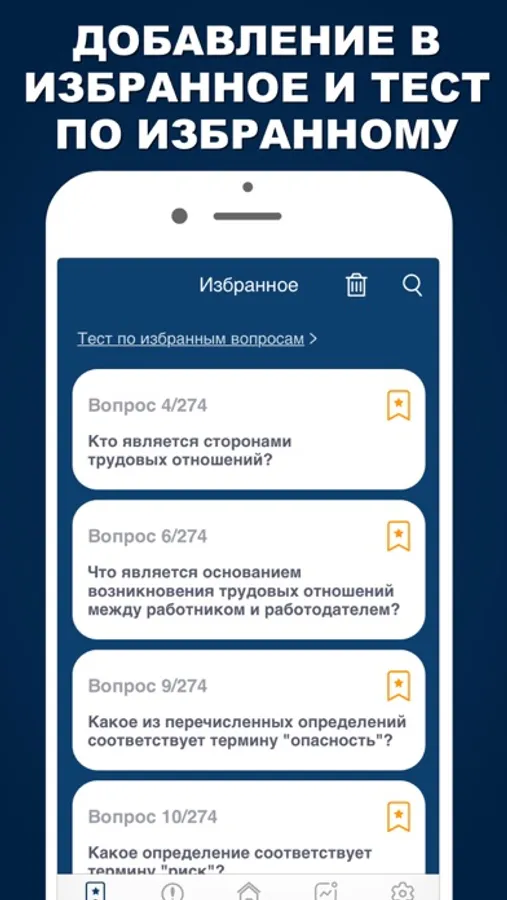 ► Избранное - можно добавлять вопросы в Избранное из всех трех режимов, а также из Топа ошибок.