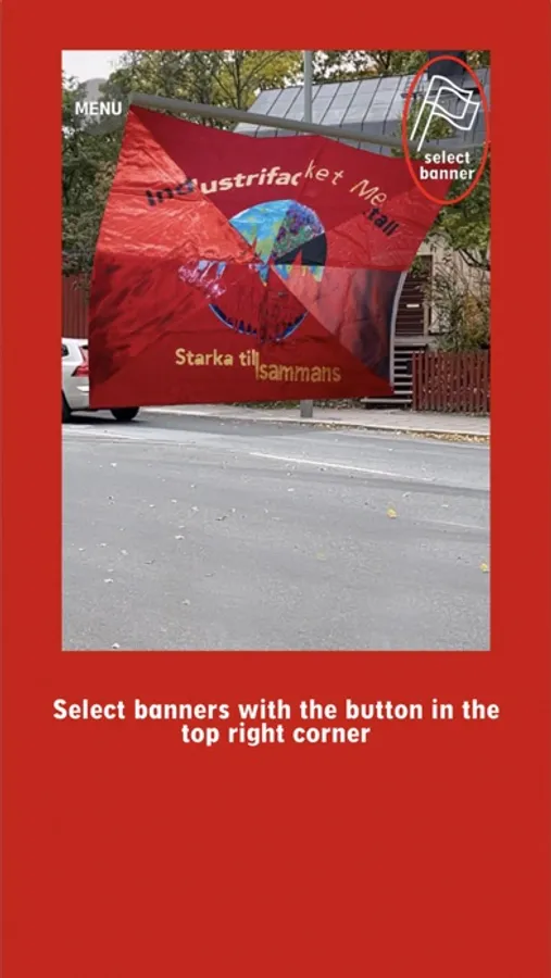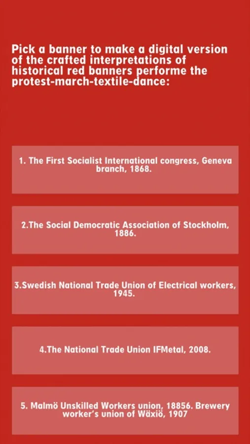 The app "Together with Red Banners" is part of the art work "Together with Red banners" based on collective artistic research on Red banners of the Swedish working class movement conducted by artist and professor Bella Rune and her Textile Master students from Konstfack University of Art, Craft and Design; Lea Constan, Alexander Jakobson, Linette Tran, Matilda Envall, Maja Fredin, Linea Matei, Alma Winkler, Malin Hallgren, Hazel Mallon, Sara Lundgren, Frida Nordelöw, Amanda Nordqvist, Hanna Molly Brown, Josefin Gäfvert and Karen Modrei. The artistic research is made in collaboration with researcher Margareta Ståhl, curator Michele Masucci, programmer Jonas Lythell and art space Mint, ABF, Stockholm.