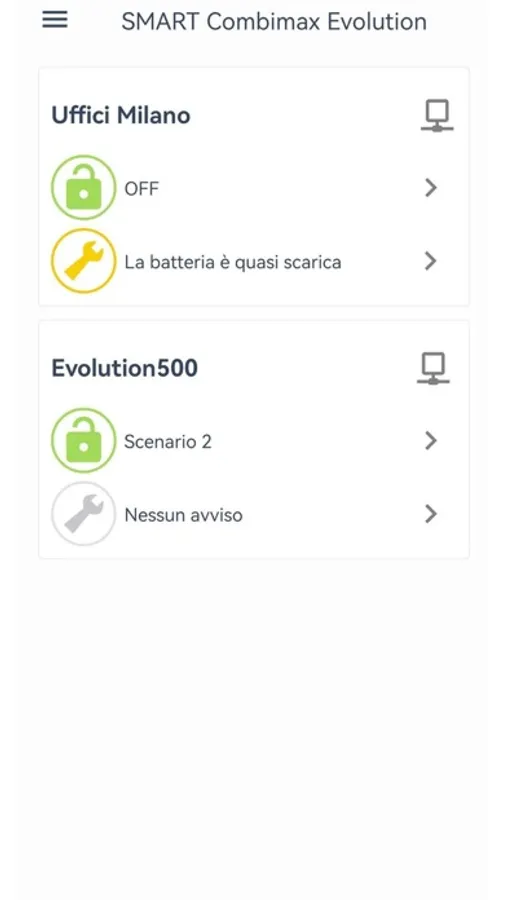 Tramite COMBIMAX EVOLUTION SMART è possibile controllare più sistemi: grazie alla gestione multi-centrale puoi infatti interagire con più installazioni, senza limiti. In questo modo si possono controllare in maniera unitaria tutti i propri impianti (casa, ufficio, azienda e così via).