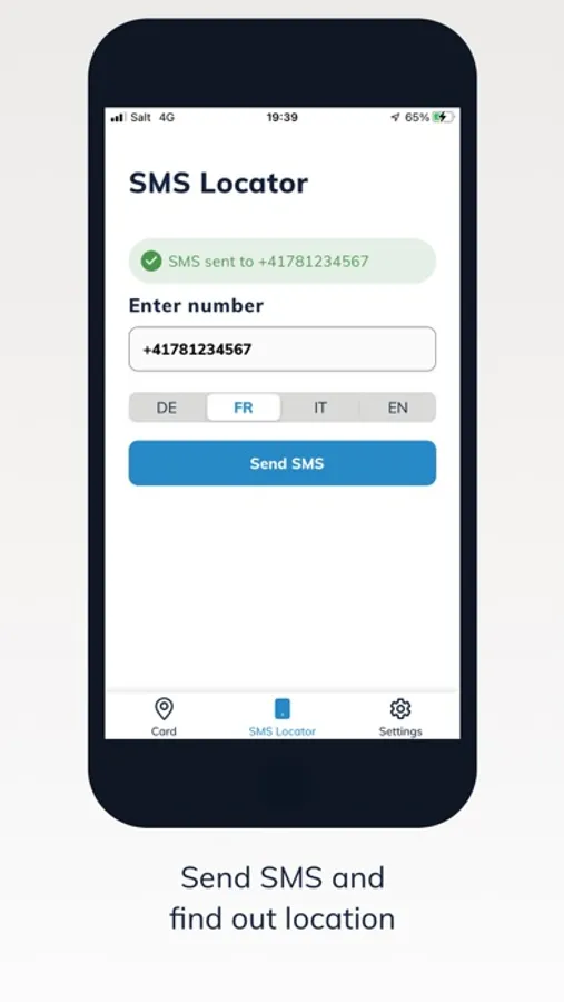 • Information on: Time, phone number, battery status, coordinates (CH1903/WGS84), accuracy of position (meters/feet), altitude meters