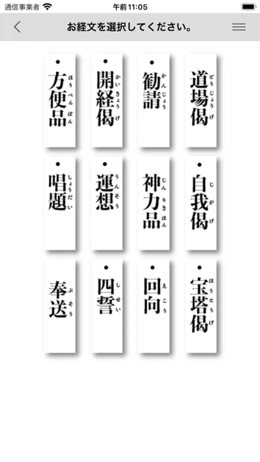 ご自宅での朝夕のおつとめでは、収録されている12のお経のうち、9つのお経をお唱えするのが一般的です。(お経の選択画面にて、対象のお経を確認、選択いただけます。)