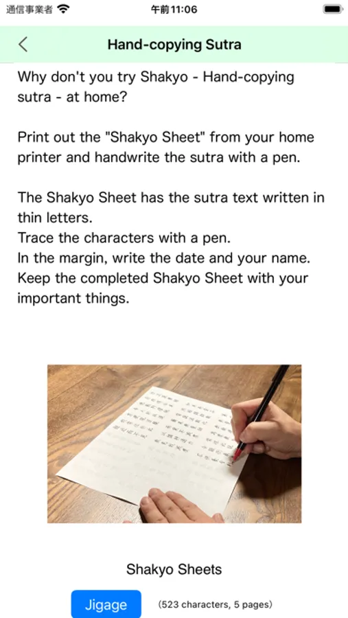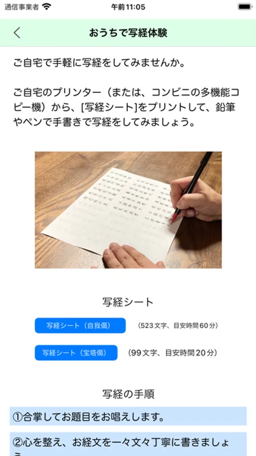 また、ご自宅で手軽に写経を体験いただくため、「写経シート」を印刷する機能を追加しました。([メニュー]→[おうちで写経体験])