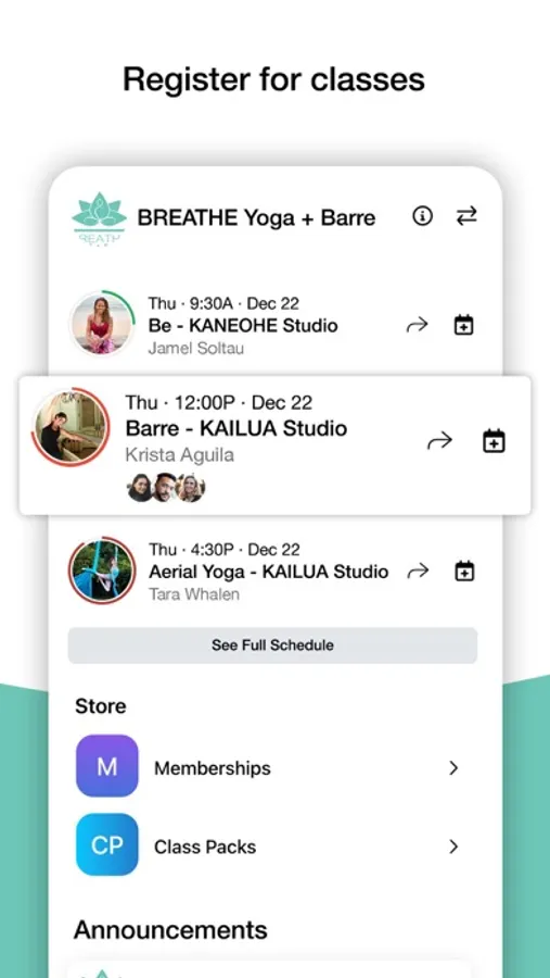 Finding memberships, scheduling appointments and connecting with your studio 'Ohana can all be done right here on the app! You'll also stay up to date with studio announcements and exclusive promotions so you won't miss a thing.